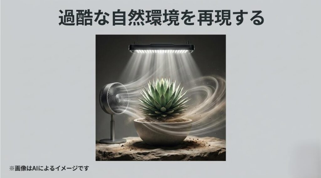 しかし、ただ強い光を当てるだけでは、あのカッコいい「締め作り」は完成しません。ここで私が声を大にしてお伝えしたいのが、「人工的な風の物理的な役割」です。風が全く当たらない停滞した環境では、株の周囲に湿った空気がどんよりと滞留し、蒸れて葉が傷んだり、最悪の場合は細菌が繁殖して腐敗する原因になります。さらに重要なのは、風には「鉢の中の土の水分を強制的に蒸発させる」という極めて重要な仕事があるんです。風が葉に当たることで、植物は蒸散を促され、それに伴って根から水分を吸収する力も強まります。